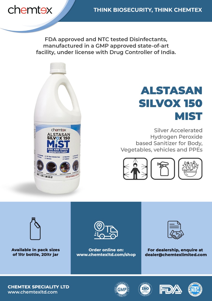 Introducing, ALSTASAN SILVOX 150 MIST, 0.5% Accelerated Hydrogen Peroxide (CDC recommended virucidal formulation) for atomized spraying on skin, fabrics, car, rooms, grocery bags, food packets, vegetable washing, etc. Application of ALSTASAN SILVOX 150 MIST ensures rapid disinfection of application areas within short contact time leaving mist and oxygen. It is proven effective for decontamination of soft surfaces when applied as a spray with no mechanical wiping.